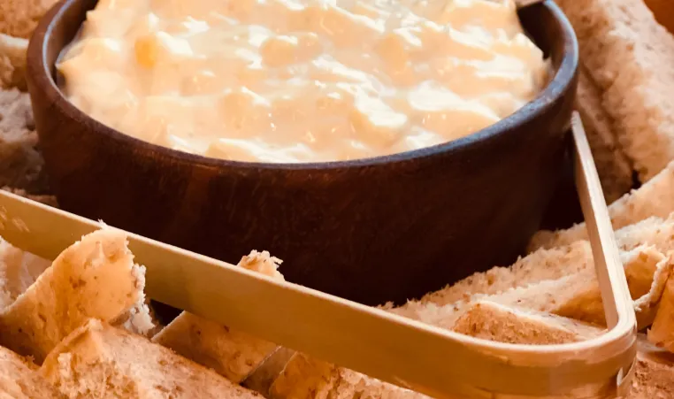 - Bring to a simmer, transfer to a fondue pot or slow cooker, and serve with chunks of rustic whole wheat bread and a variety of raw vegetables.
